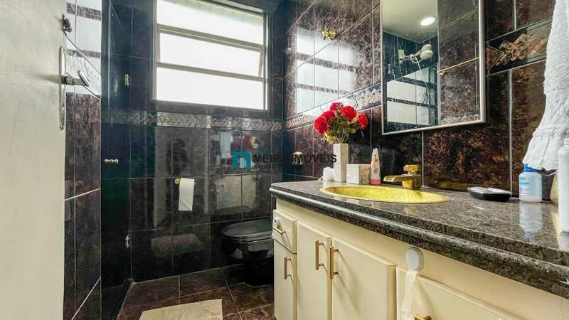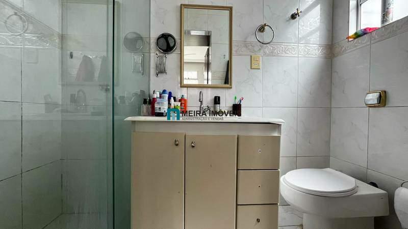 • Banheiro social com bancada em granito, armário, box em vidro temperado e espelho;