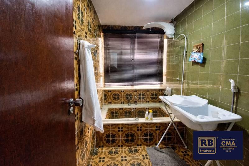 Banheiros (social e suíte) equipados com armários, espelhos e box em blindex.