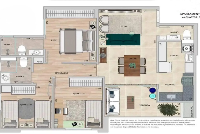 Sala ampla para 2 ambientes com piso em porcelanato, varanda, lavabo, 03 quartos confortáveis com armários e piso em laminado de madeira sendo 01 suíte, banheiro social com espelho, armário e bancada em granito, cozinha espaçosa com bancadas em granito e armários planejados e área de serviço.