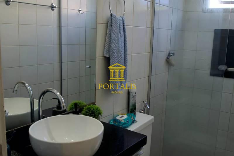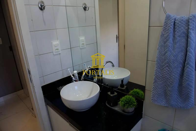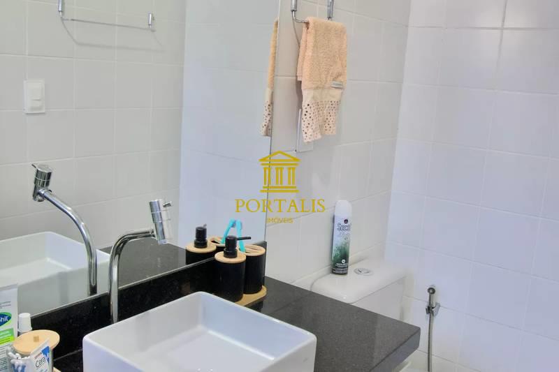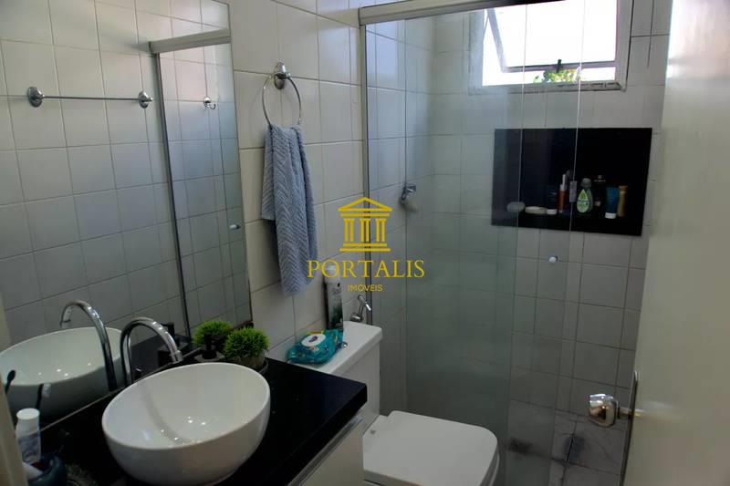 Banheiro social com bancada em granito, espelho, armários e box em blindex