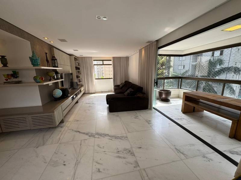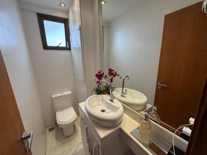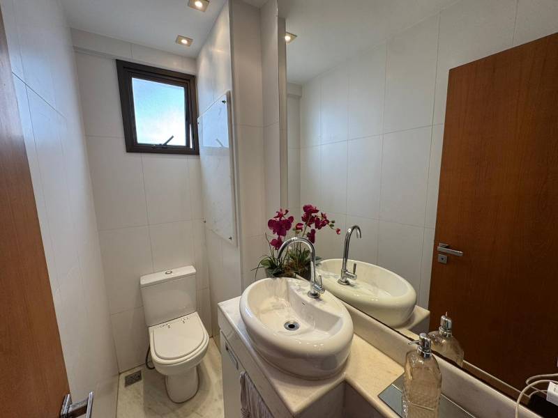 A sala ampla para 3 ambientes oferece sofisticação e integração, com rebaixamento em gesso, piso em mármore, painel planejado e lavabo. A varanda é ampla, proporcionando excelente ventilação e iluminação natural.