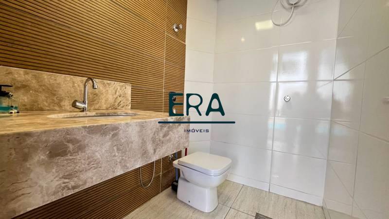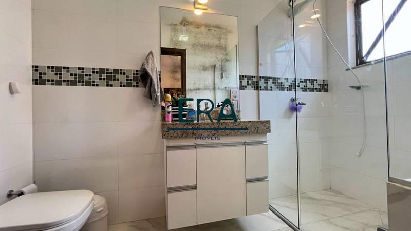 Suítes com bancada em granito, piso em porcelanato e box em vidro temperado